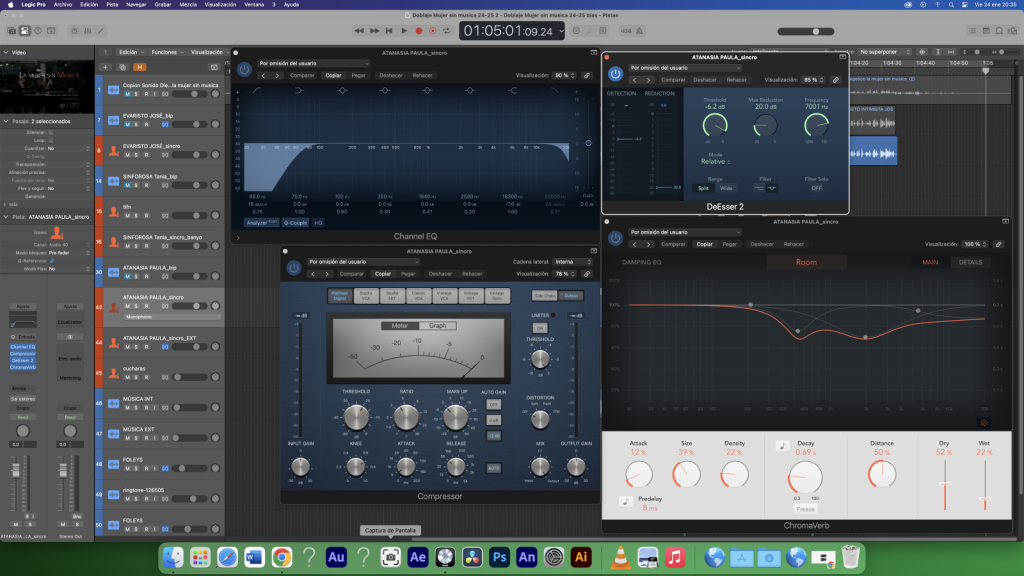 Para Eusebio (Evaristo) hemos ecualizado la voz para quitar sobretodo de los graves (120Hz), hemos metido un compressor, un DeEsser y finalmente una reverb para ambientar la sala, que será igual para Paula (Atanasia).