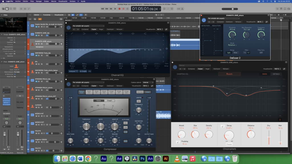 Para mejorar ambas voces en la entrevista, se llevó a cabo un procesamiento de los audios por separado. También se aplicó un tratamiento a la música.