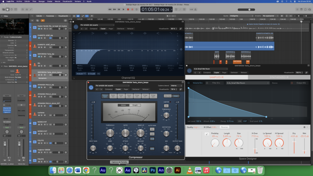 Para Tania (Sinforosa) hemos aplicado una ecualización (53Hz), un compressor, además de una reverb, esta última es la más importante porque da la sensación de que se encuentra en un baño.